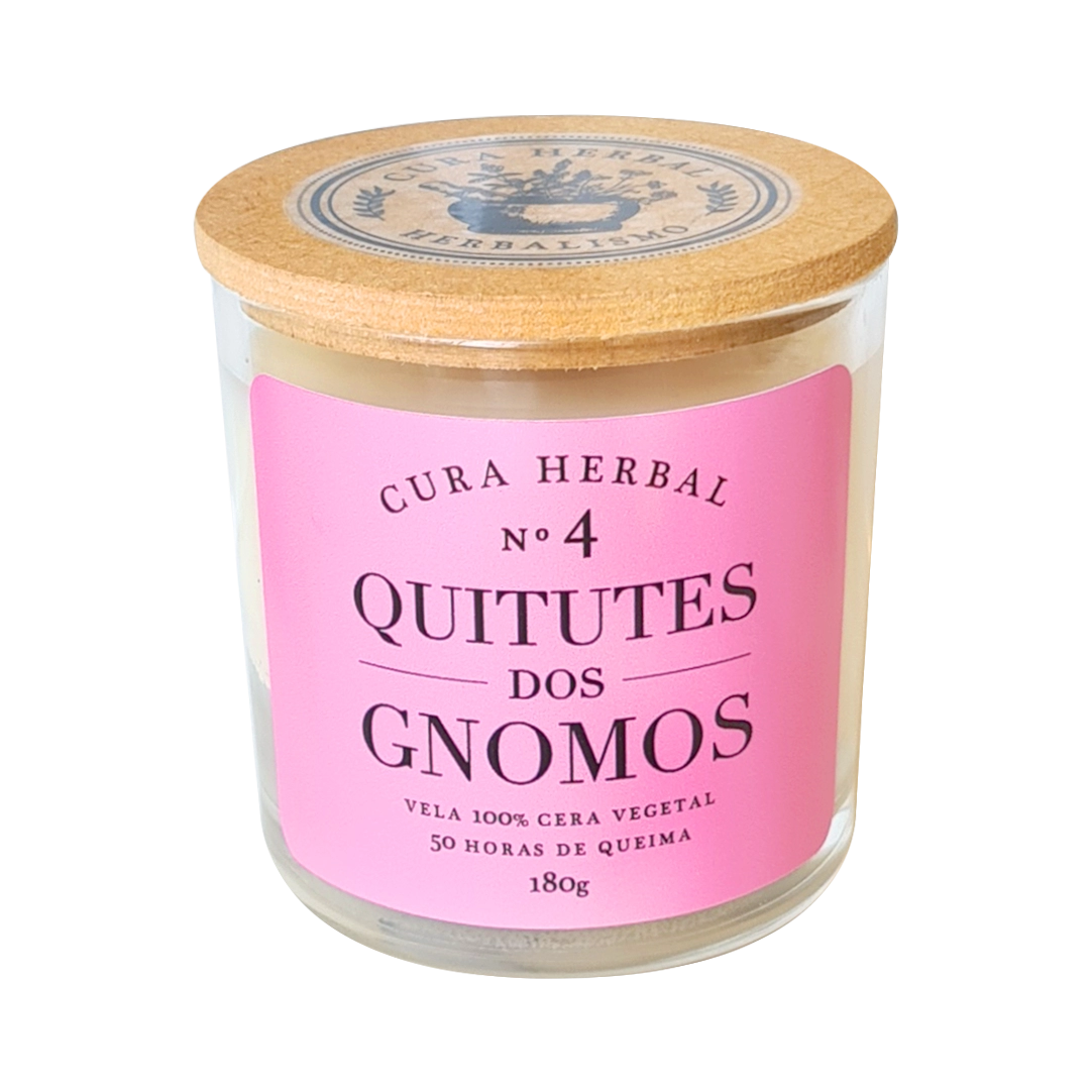 A vela Cura Herbal Quitutes dos Gnomos tem aroma doce de Romã, Frutas Silvestres, Flores do Campo e Caramelo.