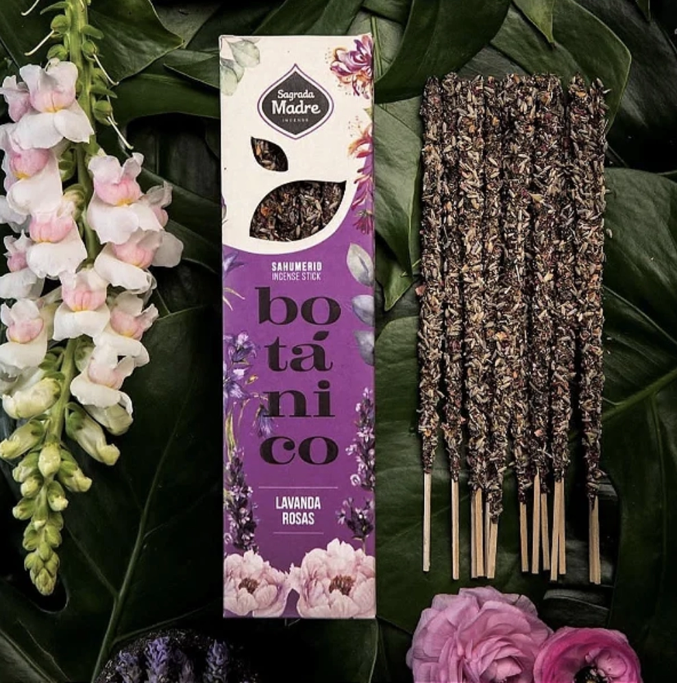 A linha de incensos Sagrada Madre é 100% artesanal, exportado da Argentina, é feito com produtos exclusivamente natuais que prezam pela sustentabilidade, possuindo selo ECO-FRIENDLY e embalagem reciclável. A marca também preza por sustentabilidade ambiental através da criação do Programa de Reflorestação de Palo Santo Sagrada Madre. A linha de incensos Botânico da Sagrada Madre foi criada com novas fórmulas a base de extratos de frutas e carvão vegetal que garantem uma limpeza profunda e um aroma sofisticado com uma duração de UMA HORAS de queima. O Incenso Botânico Sagrada Madre - Lavanda e Rosas é especial por seu poder de atração da fortuna e da inspiração de sentimentos de satisfação e agradecimento, pela fragrância de lavanda e rosas, além de possuir uma excelente fórmula composta por lavanda e rosas, que garantem os princípios básicos da purificação e um aroma doce e floral.