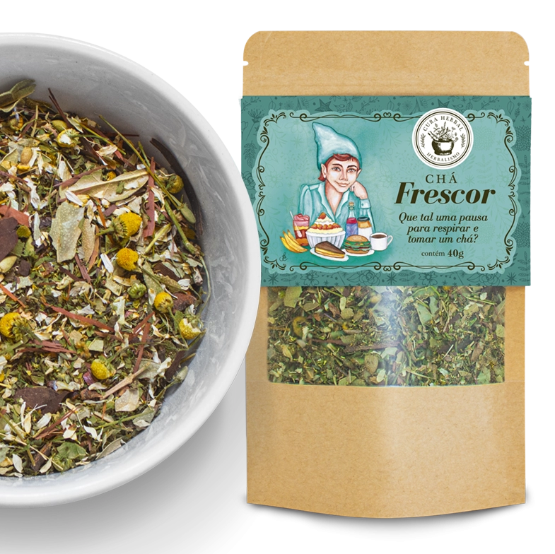 O Chá Frescor é composto por Hortelã, Camomila, Boldo, Gengibre e Anis-Estrelado. Possui um sabor mentolado profundo e revigorante.