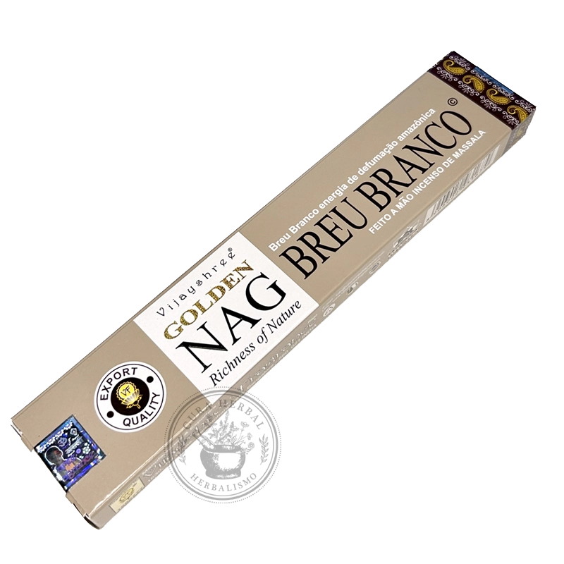 Energia de defumação amazônica. Com um aroma amadeirado e floral, o Incensos Indiano de Massala Golden Nag Breu Branco age poderosamente na limpeza e purificação do ambiente, onde quer que esteja. Incenso Vijayshree Série Golden Nag são à base de massala fragrâncias premium feitas com ervas, especiarias e extratos florais. Incensos massala feitos a mão.