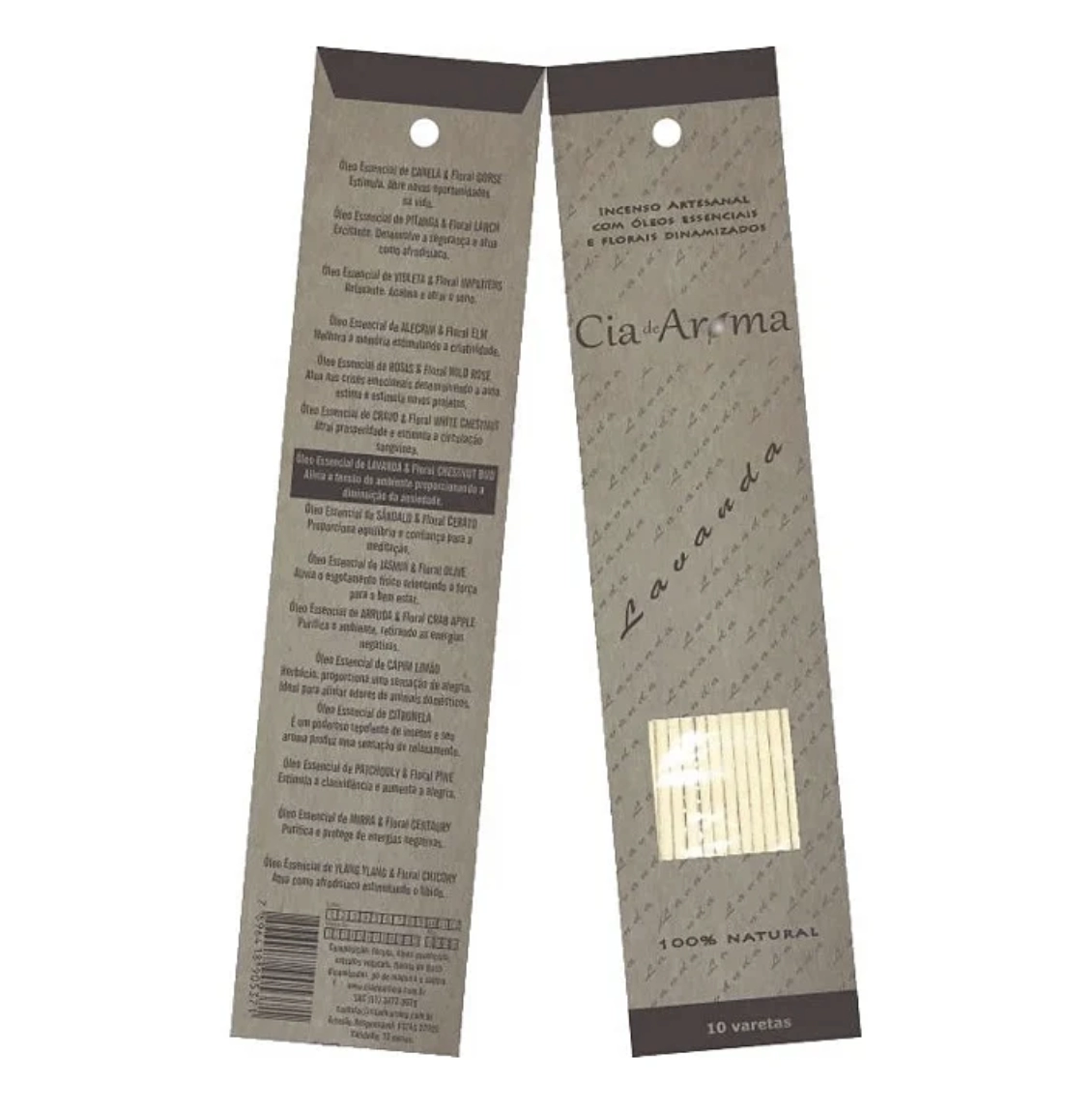 PRODUTO: Incenso Natural Vareta Cia de Aroma - Lavanda QUANTIDADE:10 varetas DIMENSÕES CAIXA: 28 cm x 6,5cm COMPOSIÇÃO: Fécula, óleos essenciais, extratos vegetais, florais de Bach dinamizadores, pó de madeira e salitre.