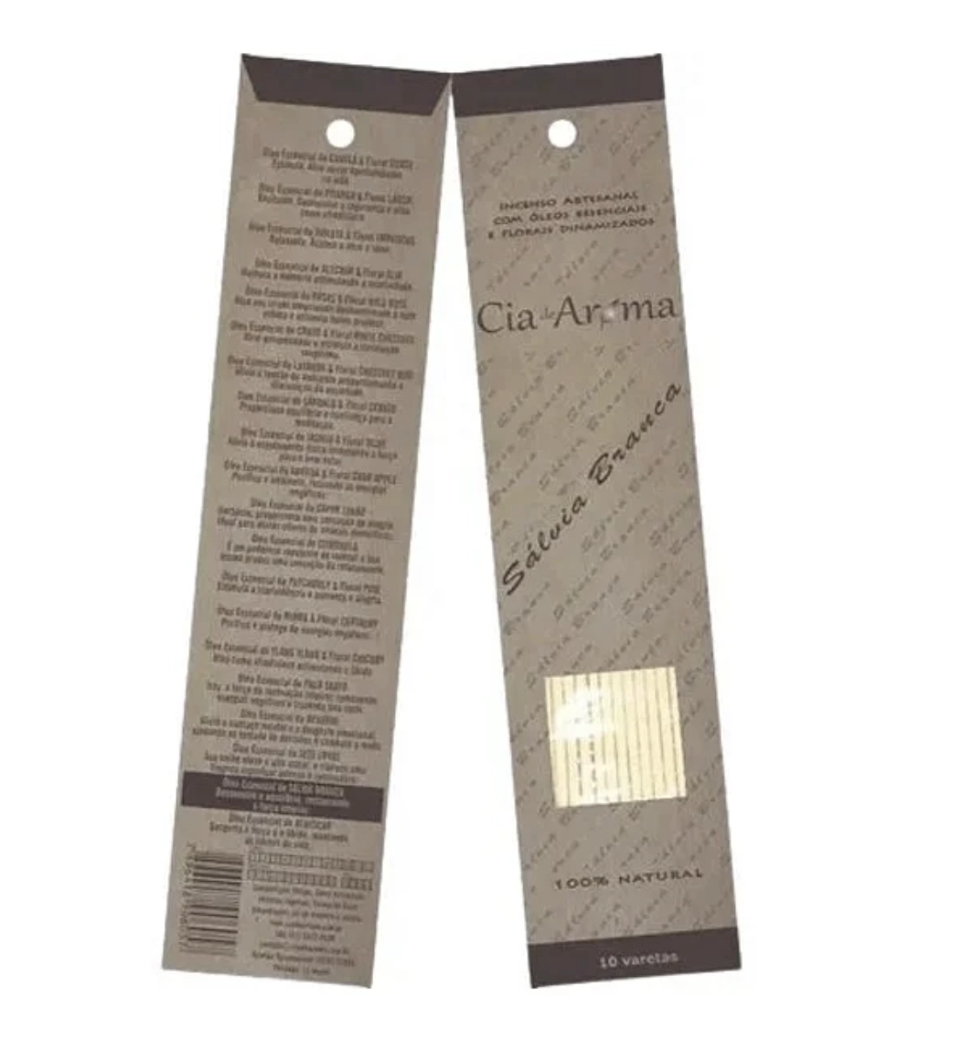 PRODUTO: Incenso Natural Vareta Cia de Aroma - Sálvia Branca QUANTIDADE:10 varetas DIMENSÕES CAIXA: 28 cm x 6,5cm COMPOSIÇÃO: Fécula, óleos essenciais, extratos vegetais, florais de Bach dinamizadores, pó de madeira e salitre.